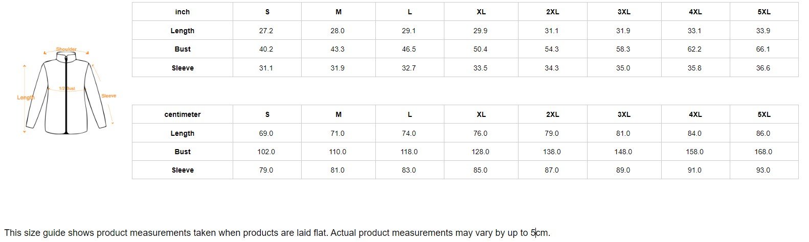 | centimeter | S | M | L | XL | 2XL | 3XL | 4XL | 5XL |