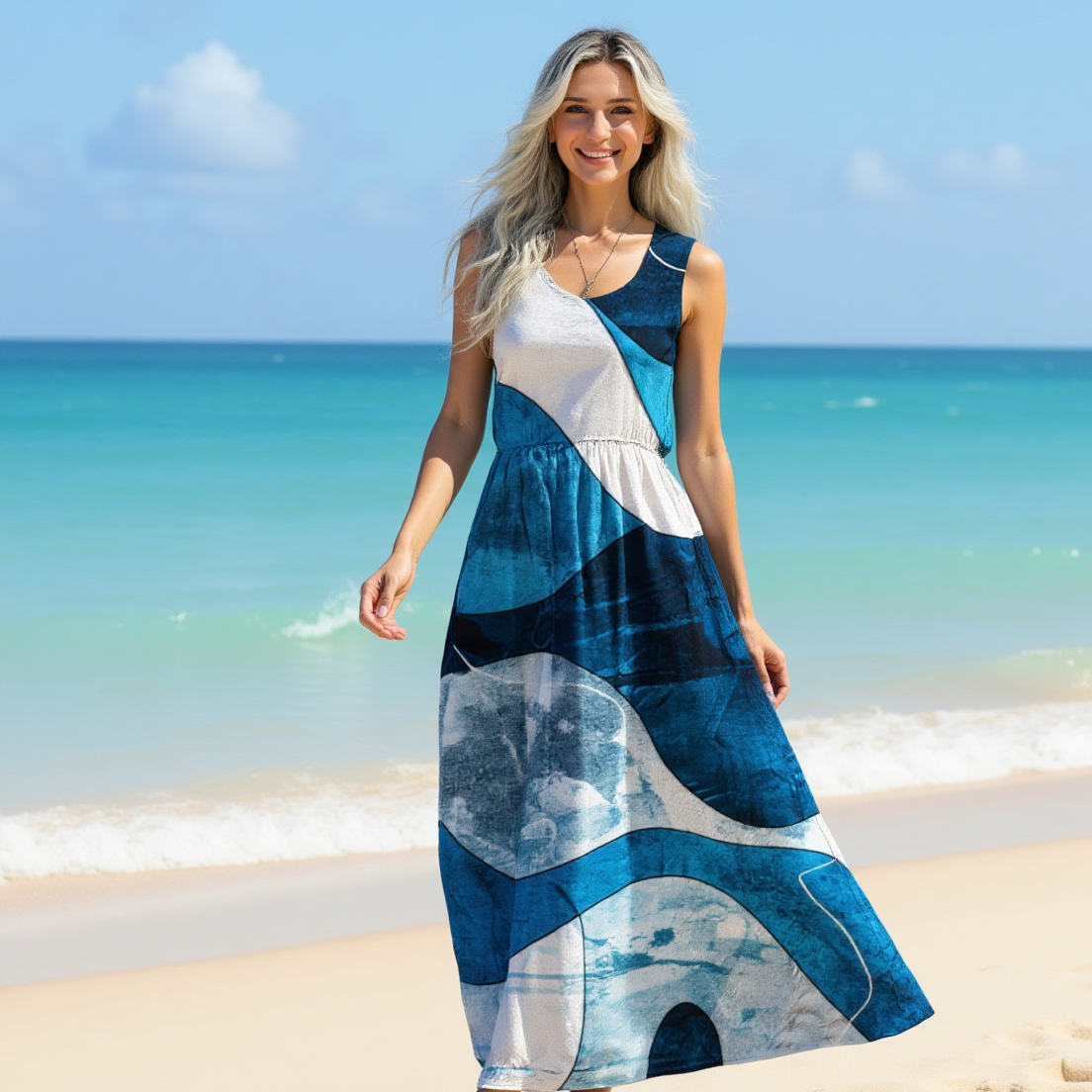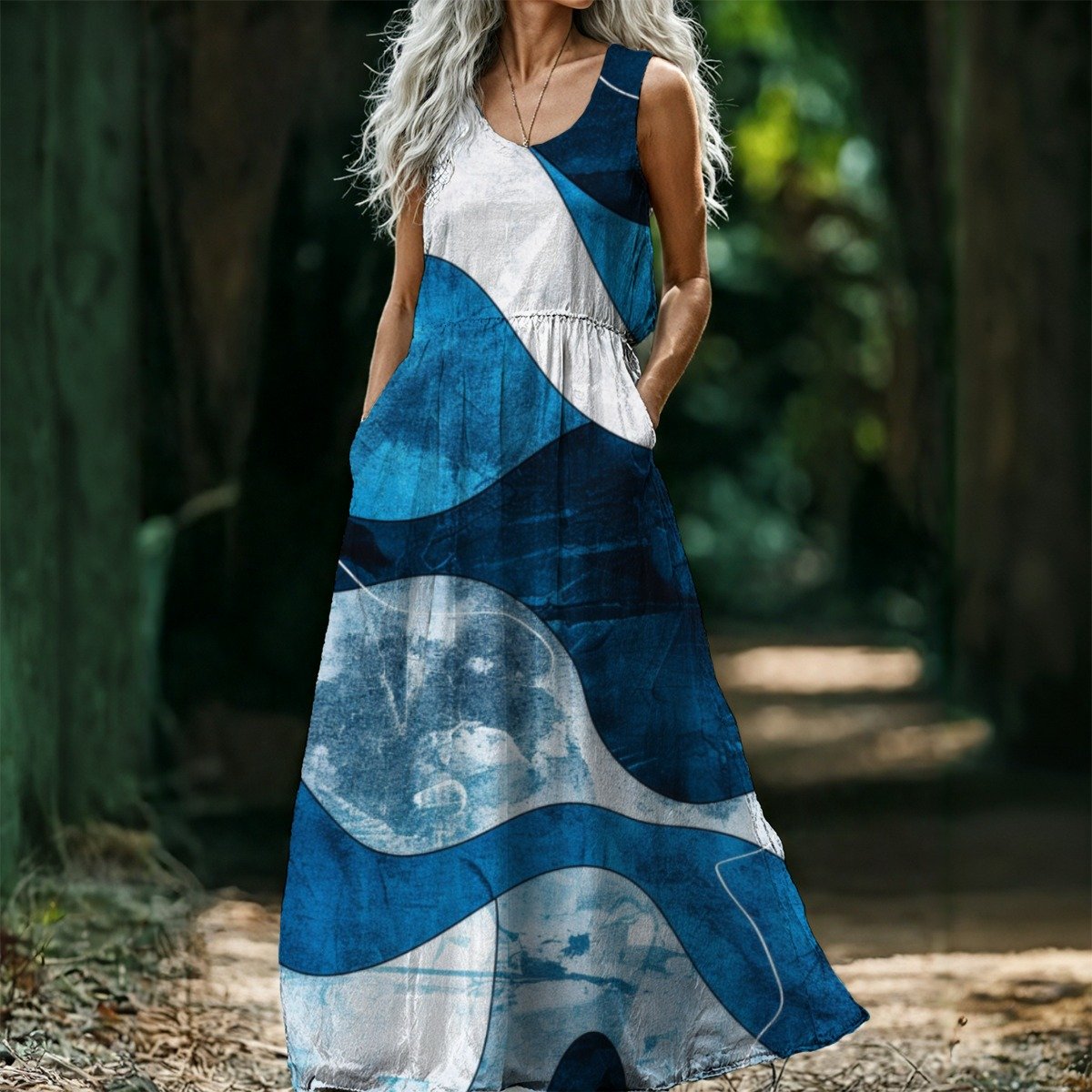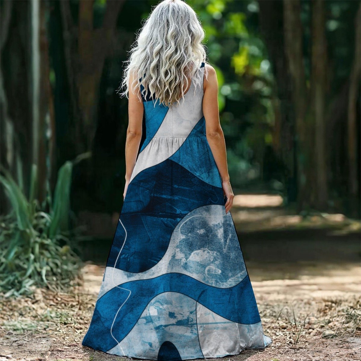 This sleeveless maxi dress is made from lightweight 140G polyester fabric, offering a smooth, breathable feel that’s ideal for spring and summer. The design features a fitted bodice with a high waistline and a gently flared hem, creating a flattering silhouette with graceful flow. The blue-toned tropical leaf print adds a vibrant, refreshing touch, making this dress perfect for casual outings, vacations, beach walks, or garden parties.