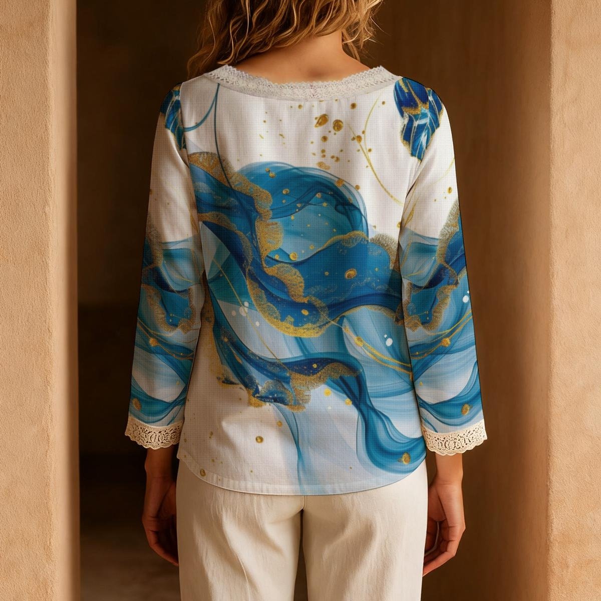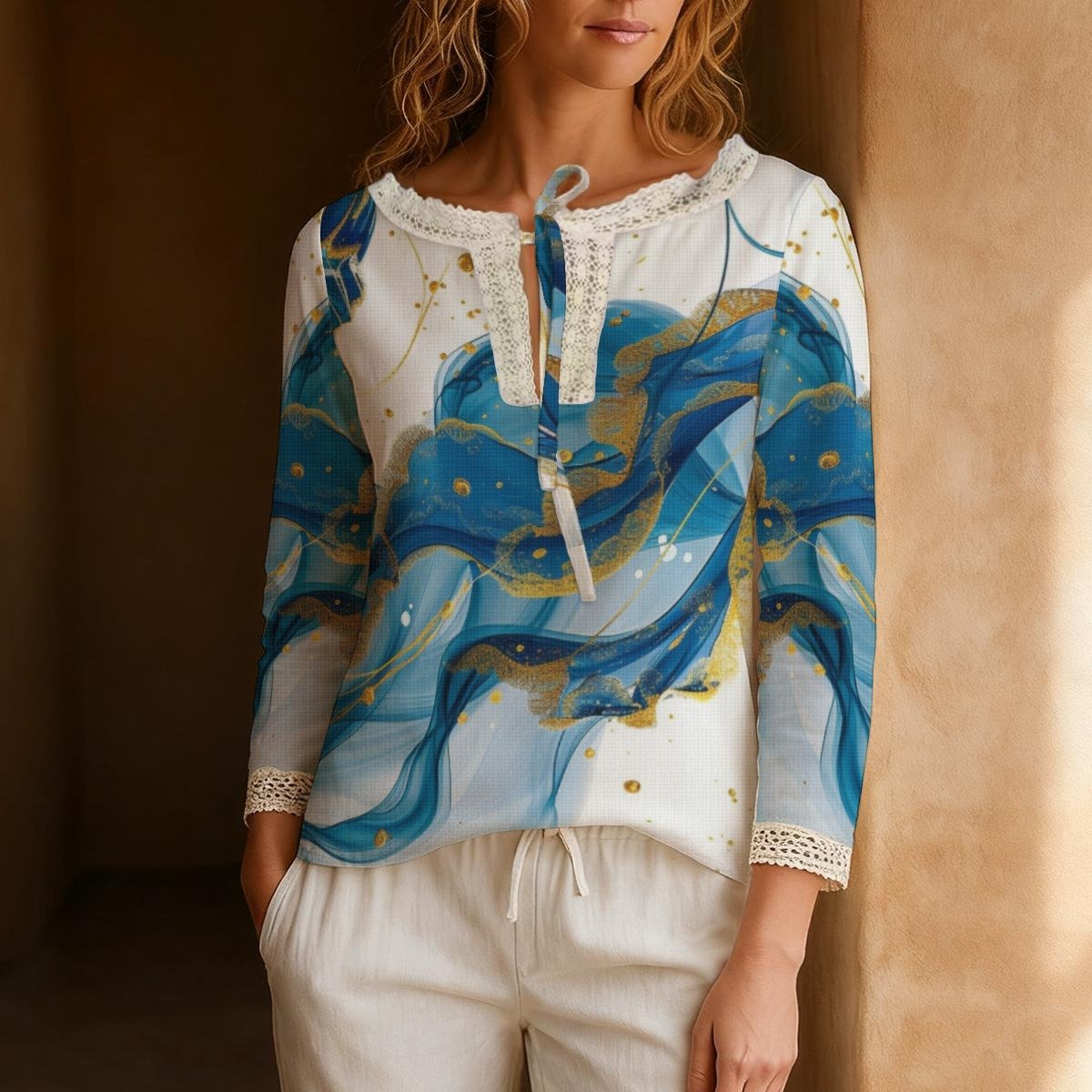 This women’s long sleeve blouse is made from lightweight linen-look fabric, offering a breathable and natural texture for all-day comfort. Featuring delicate lace trim on the neckline and cuffs, it adds a touch of elegance and femininity. The tie-neck design allows for versatile styling — wear it loose for a casual vibe or tied for a more refined look. With its simple solid color and easy-to-match design, this blouse is perfect for everyday wear, lounging at home, or vacation outings, bringing effortless charm to any occasion.
