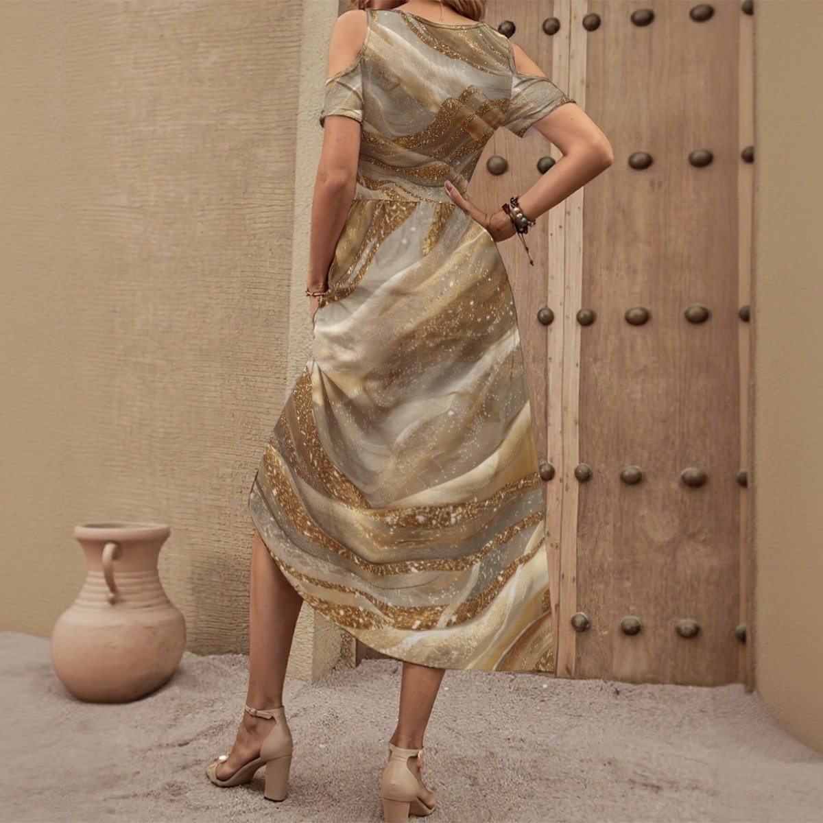 Experience effortless elegance in our off-the-shoulder maxi dress, the perfect blend of comfort and style. Made from high-quality, lightweight and soft fabric, this dress is designed to keep you cool and comfortable while looking fabulous all day long. The fitted V-neck and sleek, off-the-shoulder short sleeves flatter your shoulders for a feminine, modern silhouette. The high-rise cut, slightly nipped in at the waist, and draped at the hem for a fitted, figure-flattering drape without sacrificing comfort.