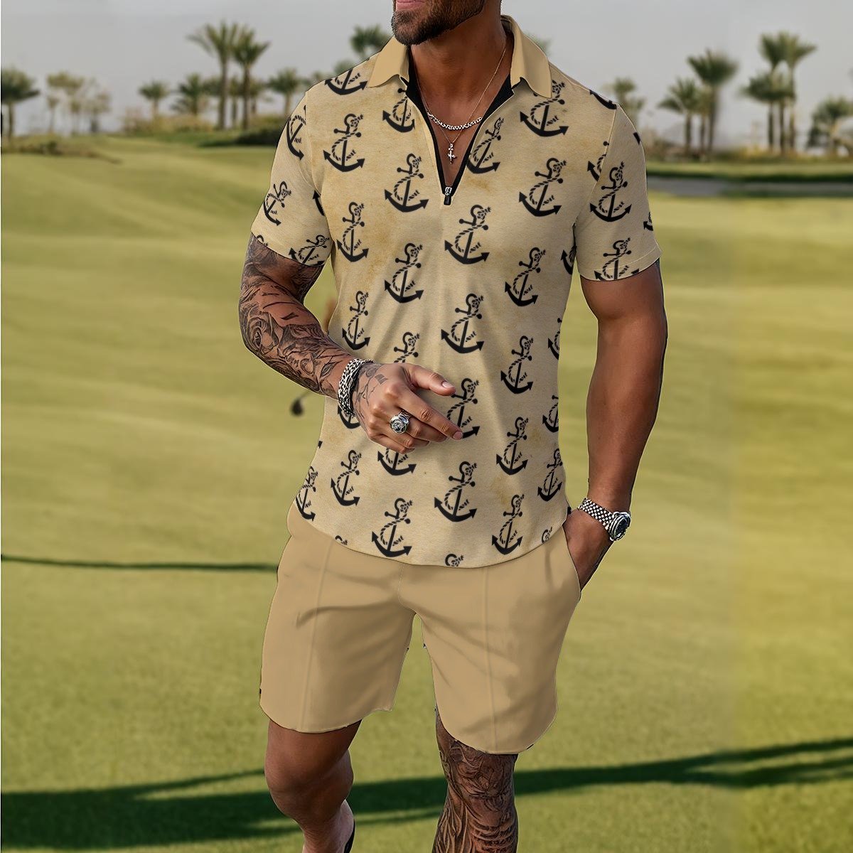 This men’s tracksuit is made from high-quality fabric that offers breathability, flexibility and comfort. The fabric is lightweight and next to the skin, making it ideal for active or casual wear during spring and summer. The top features a zip-up polo neck for a sporty yet clean look, while the shorts have a loose, above-the-knee fit and a flexible drawcord for freedom of movement.